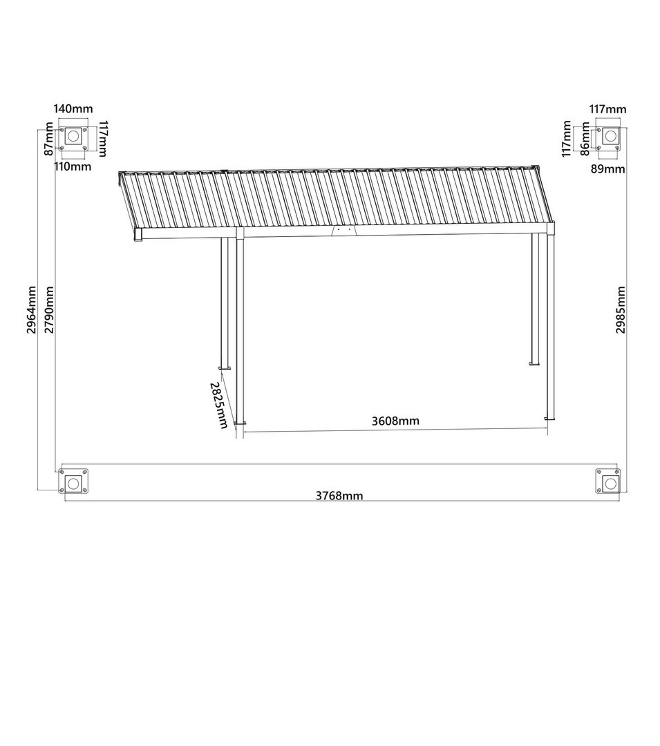 Gegalvaniseerd staal met poedercoating (polyester). Steunpalen van 80 x 80 mm, balken van 130 x 50 mm. Niet-verstelbare zonwerende lamellen van 172,3 x 30 mm. Geïntegreerd waterstroomsysteem in de steunpalen. Roestvrijstalen schroeven. Montage vereist.