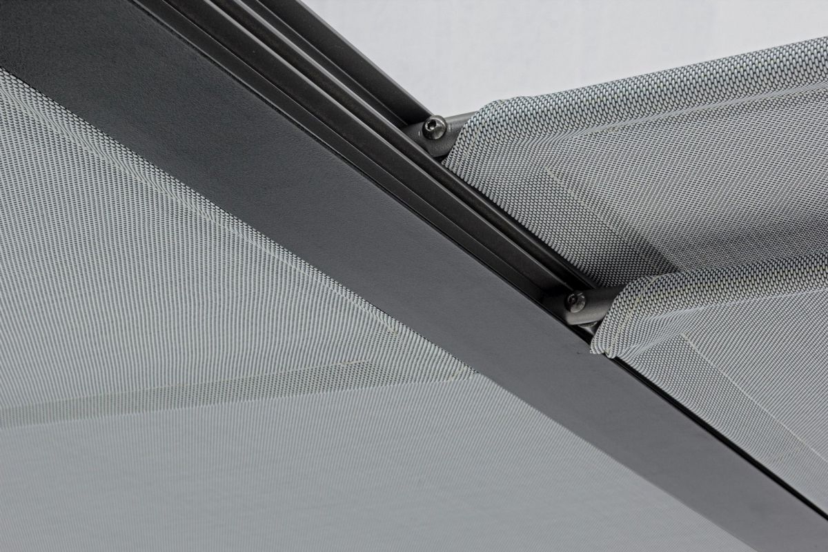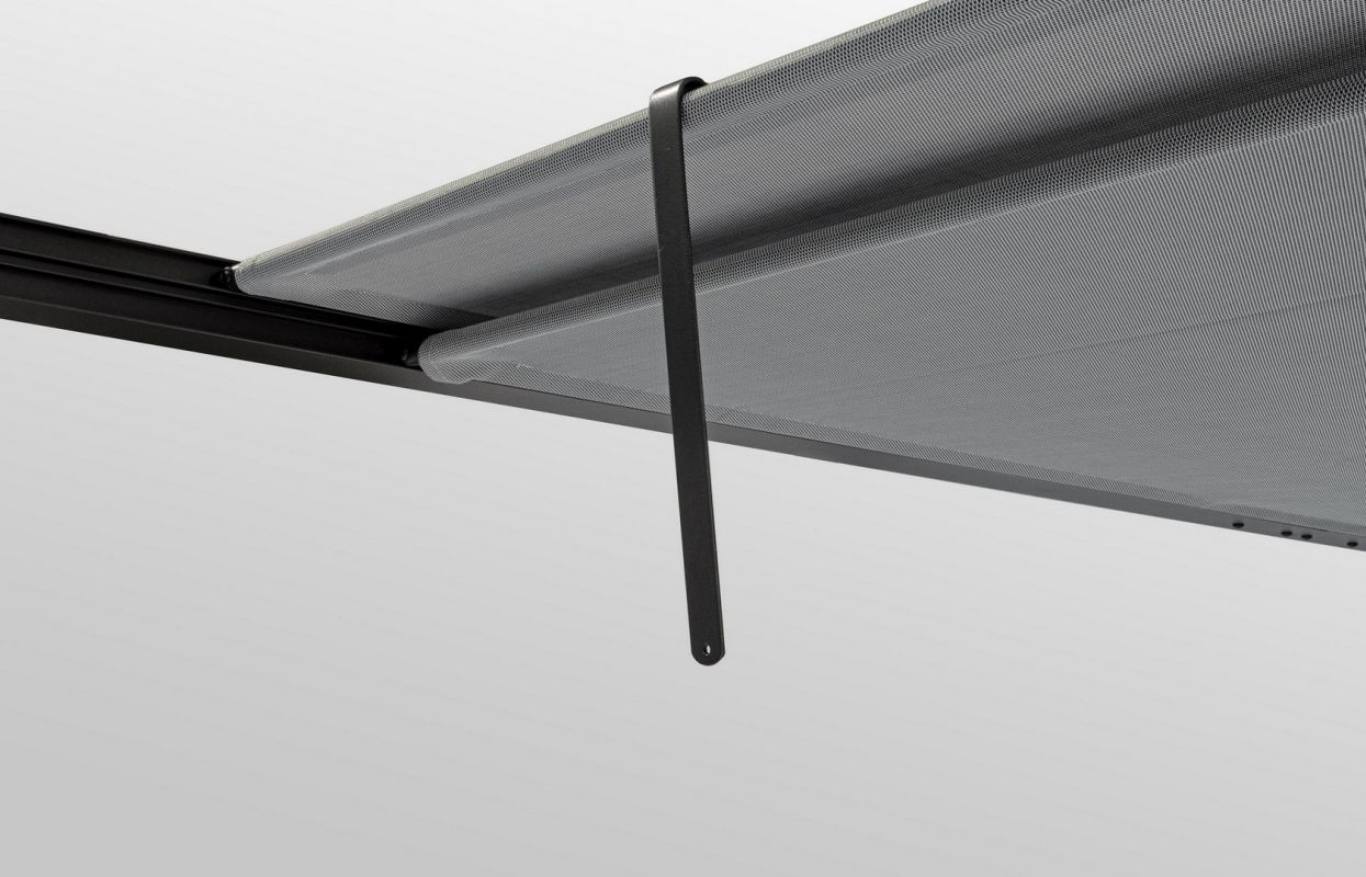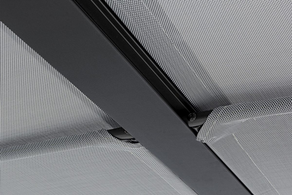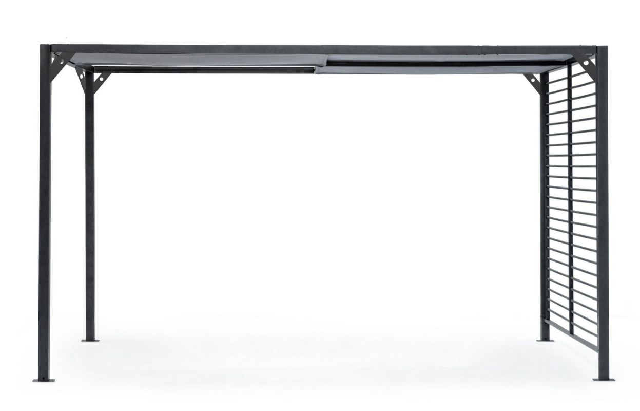 Frame van gepoedercoat (polyester) aluminium (paal 65×65 cm). Schuifbaar dakzeil van donkergrijs textiel. Moet nog gemonteerd worden.
