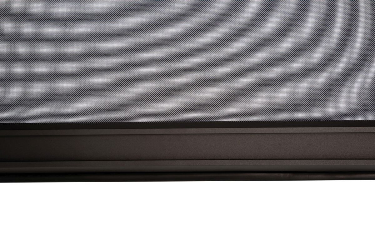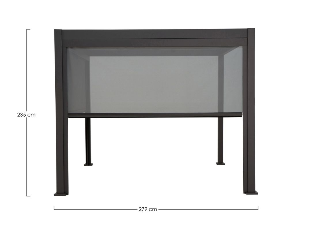 Gordijnframe en rails van gepoedercoat aluminium (polyester). Textiel 2×2. Het scherm kan handmatig worden uitgeschoven en ingetrokken via de gleuf in de onderste stang. Verstelbare uitschuiflengte. Rolsluiting, intrekbaar. Beslag van roestvrij staal. Moet nog gemonteerd worden. Compatibel met Ocean en Marea pergola’s.