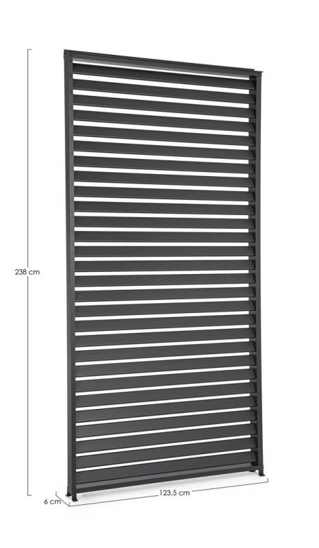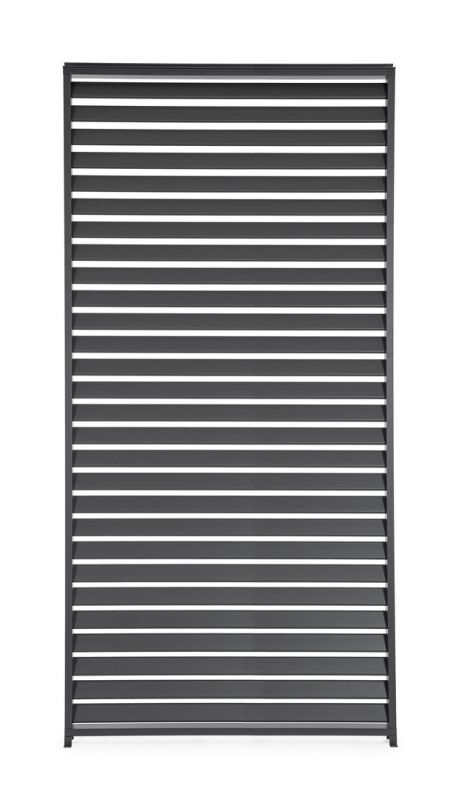 Gepoedercoat aluminium (polyester). Hoofdpalen 60x25mm. Vaste zonwerende lamellen 65x15mm. Bevestiging aan de pergola met zelfborende schroeven. Het item kan modulair worden gebruikt om één zijde van 4 meter volledig te vullen of slechts één hoek te bedekken. Beslag van roestvrij staal. Moet nog worden gemonteerd. Compatibel met de Ocean en Marea pergola’s.