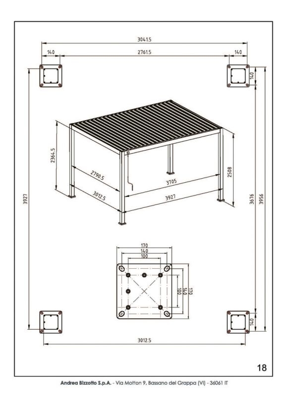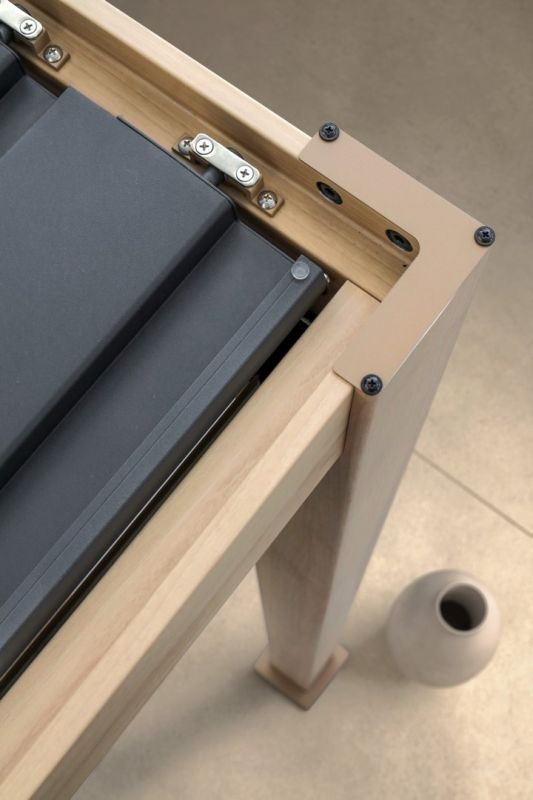 Aluminium frame. Hoofdpalen 111×111 mm, horizontale palen 140×75 mm. Lamellair dak, verstelbaar met handgreep. Dubbellaags zonwering lamellen 173×30 mm. Hoofdpalen en horizontale palen voorzien van 3D-geprinte PVC-folie (hoogwaardig laminaat) met houtnerf-effect. Geïntegreerd waterstroomsysteem in de hoofdpalen. Roestvrijstalen beslag. Montage vereist.