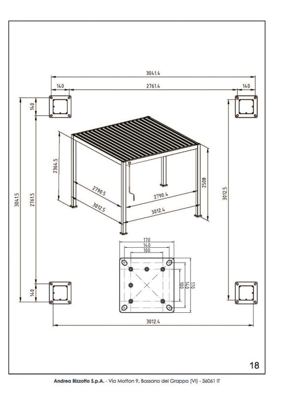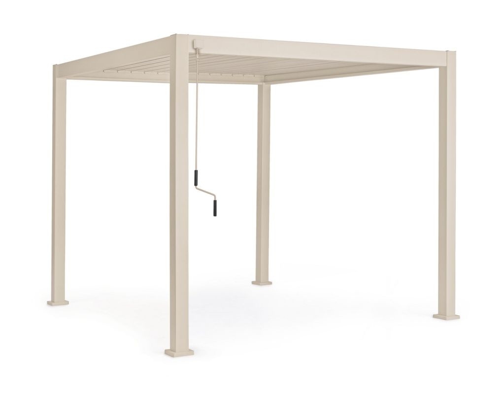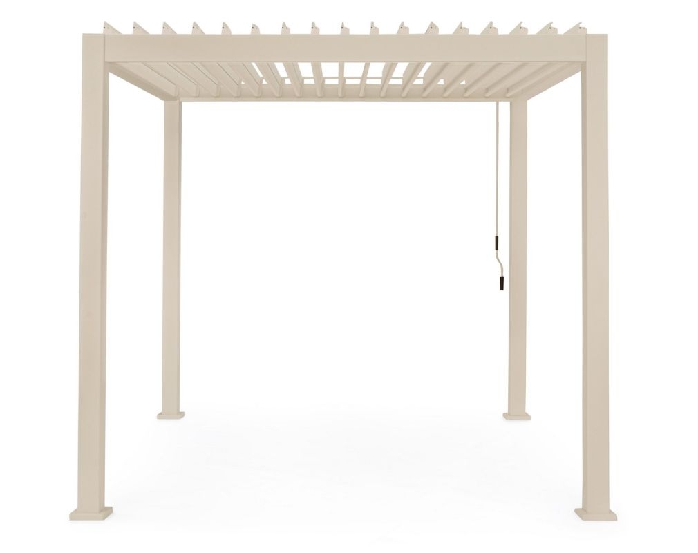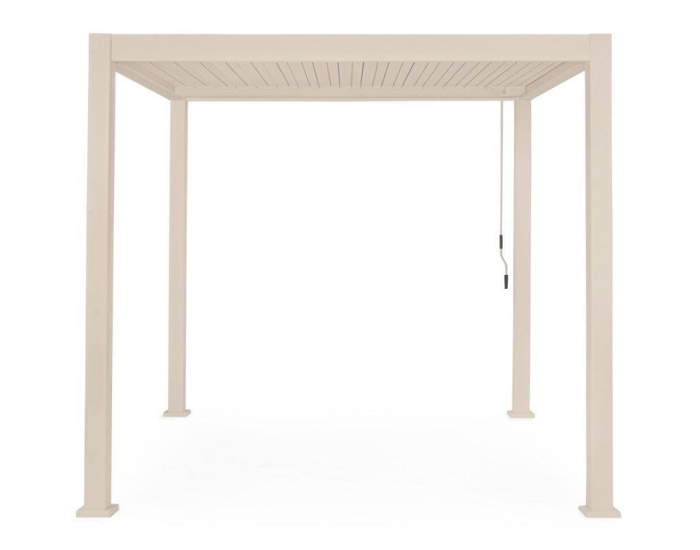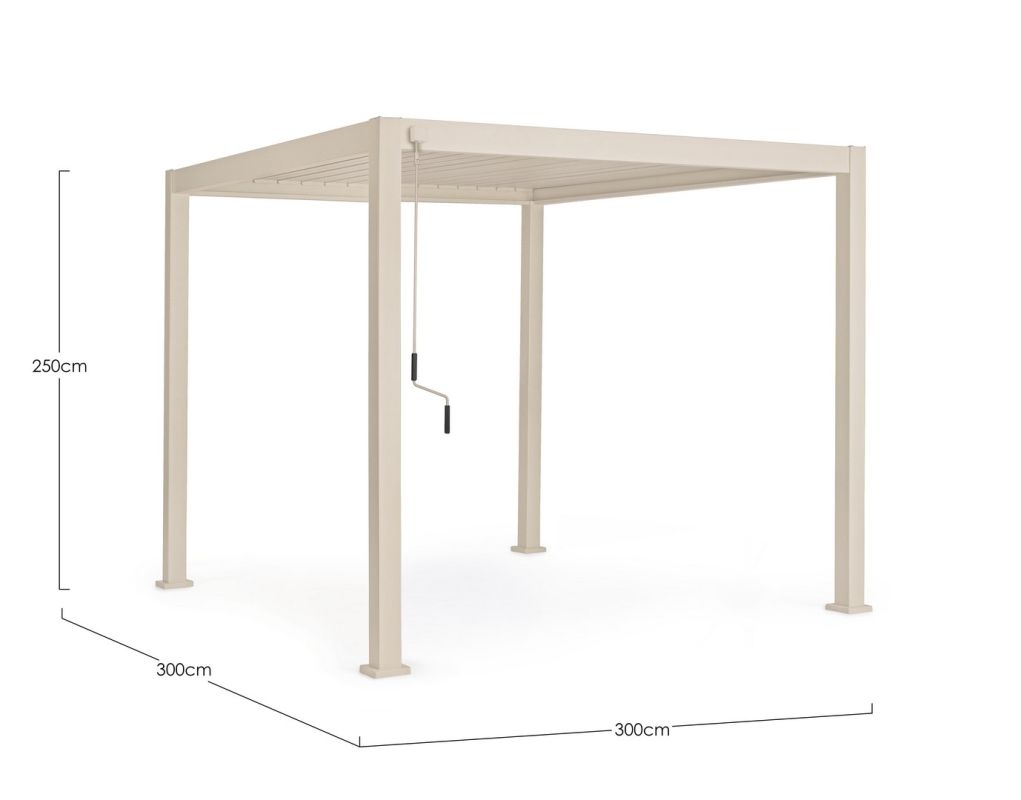 Gepoedercoat aluminium (polyester). Hoofdpalen 111×111 mm, horizontale palen 140×75 mm. Lamellair dak, verstelbaar met handgreep. Dubbellaags zonwering met lamellen 173×30 mm. Geïntegreerd waterstroomsysteem in de hoofdpalen. Beslag van roestvrij staal. Moet nog gemonteerd worden.