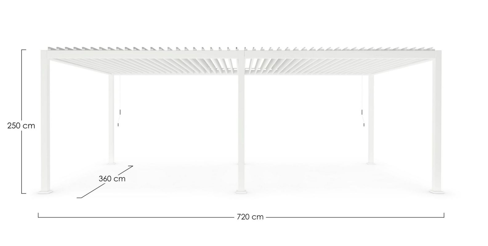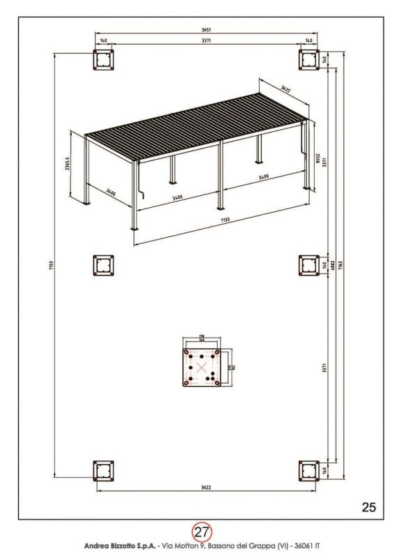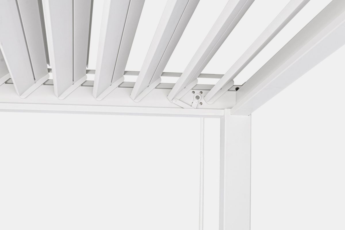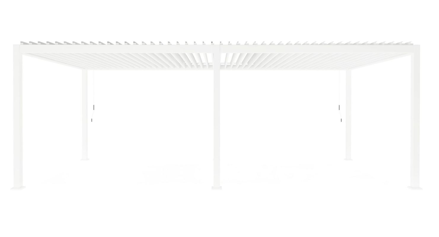 Gepoedercoat aluminium (polyester). Hoofdpalen 111×111 mm, horizontale palen 140×75 mm. Lamellair dak, verstelbaar met handgreep. Dubbellaags zonwering met lamellen 173×30 mm. Geïntegreerd waterstroomsysteem in de hoofdpalen. Beslag van roestvrij staal. Moet nog gemonteerd worden.