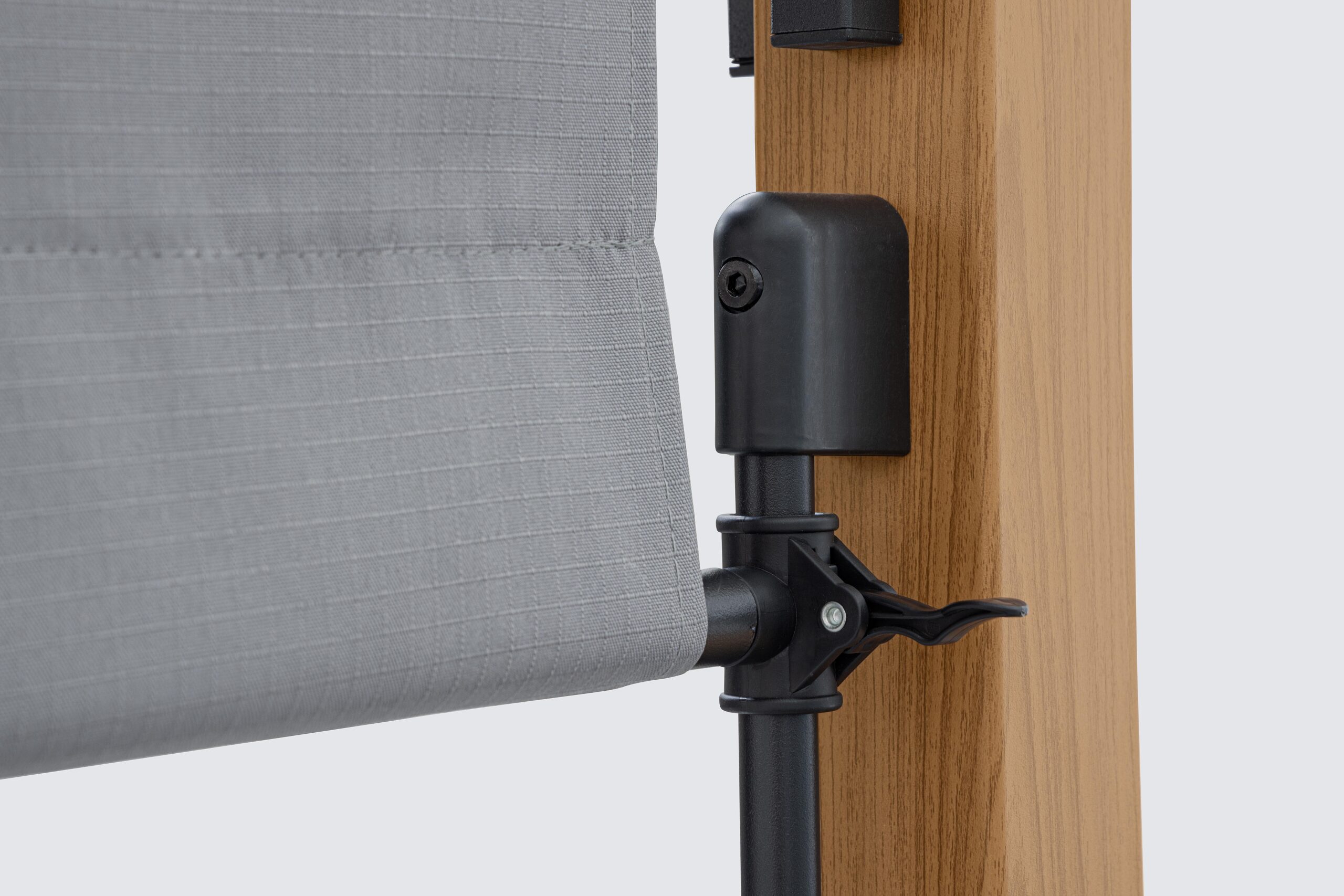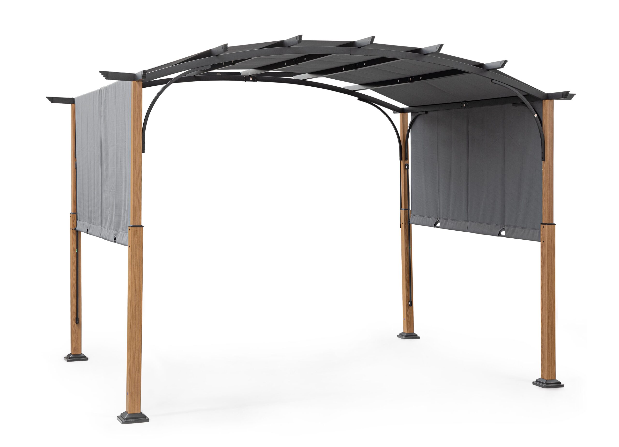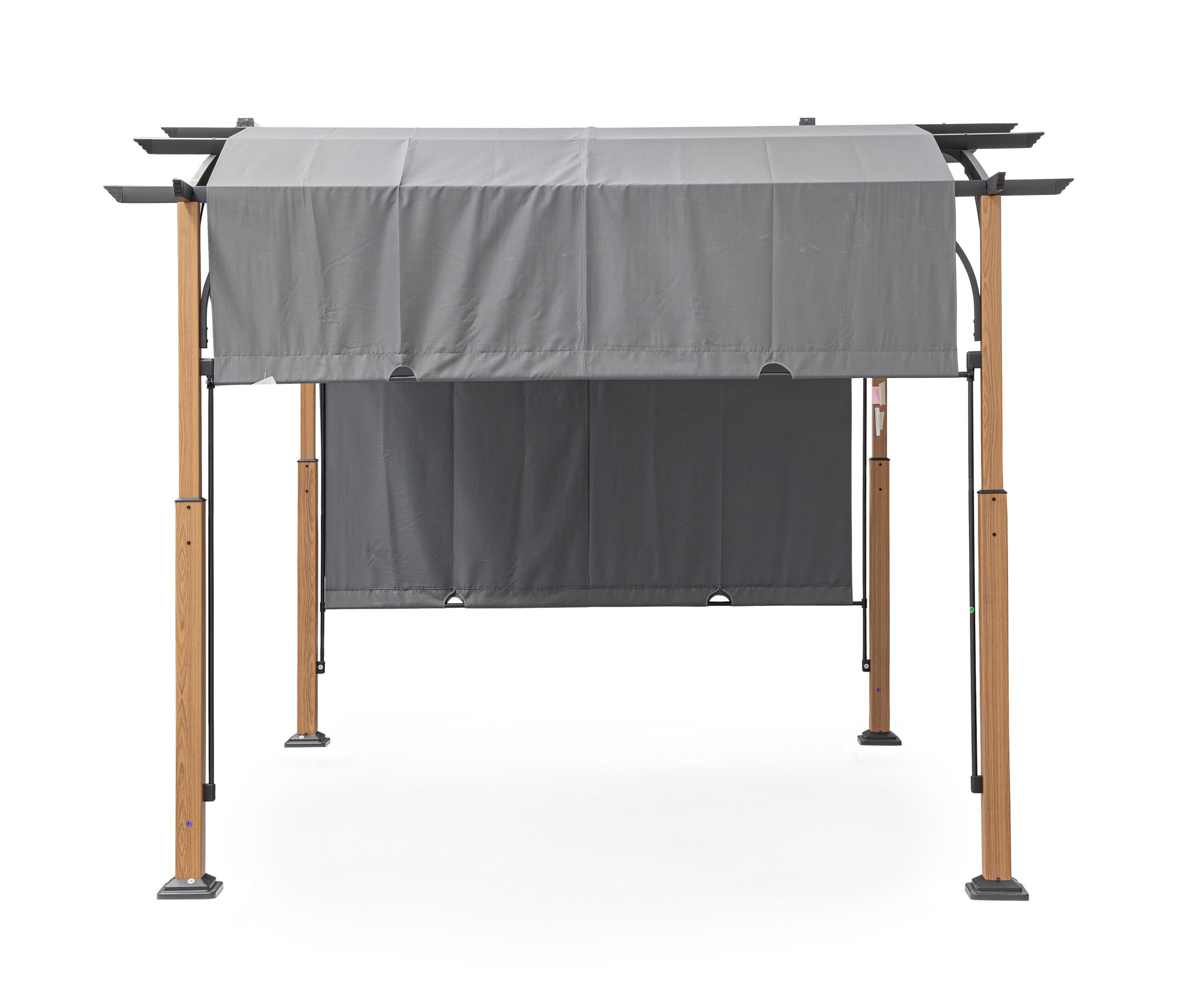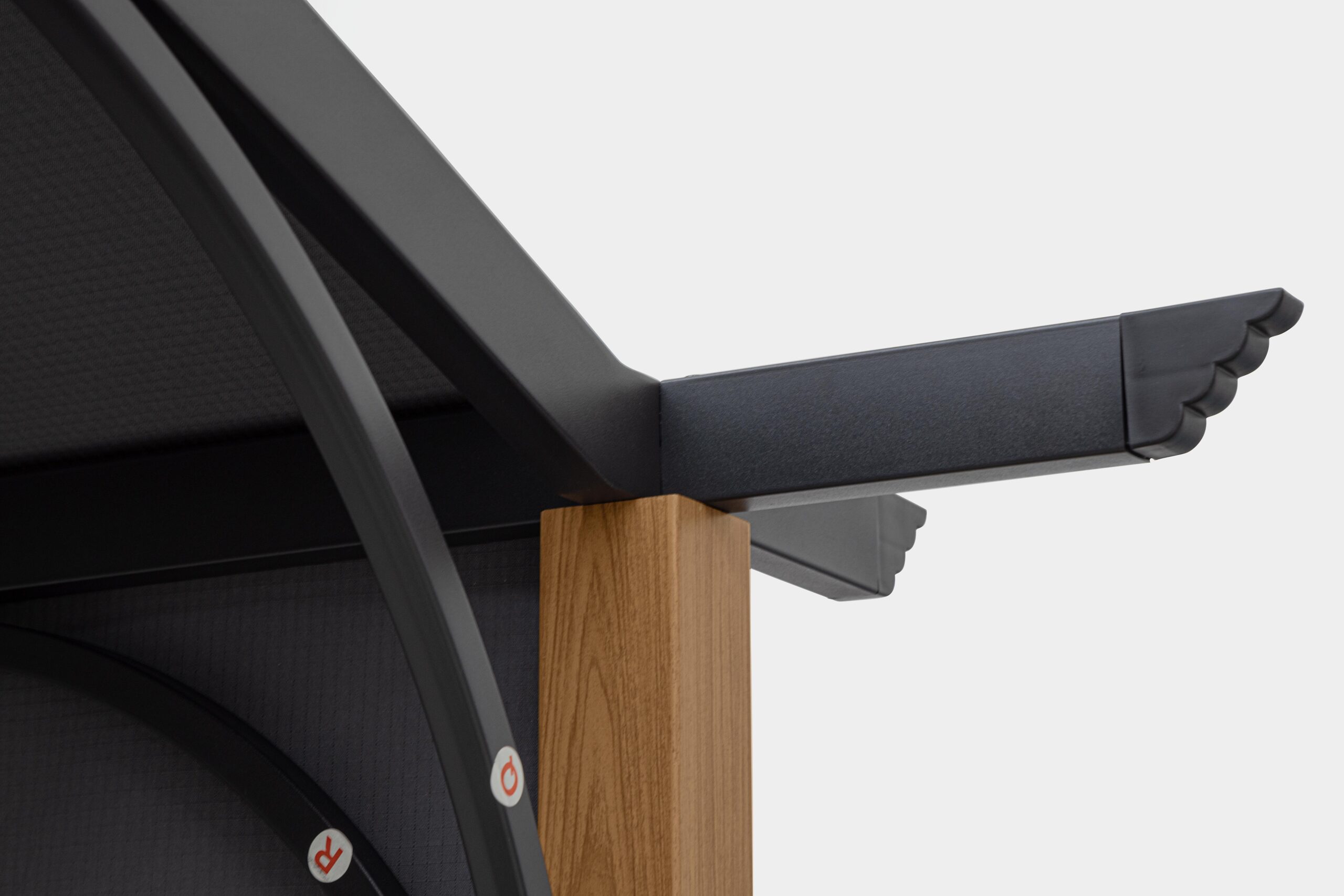 Stalen constructie, geschikt voor buitengebruik, behandeld met fosfatering en gepoedercoat (polyester). Steunpalen van 80×80/60×60 mm met houtlook. Zijbalken van 25×50 mm, dakpalen van 50×25 mm. Polyesterplaat van 180 g/m² met handmatig schuifbare scheurvaste technologie. UV-behandeld kunststof. Montage vereist.